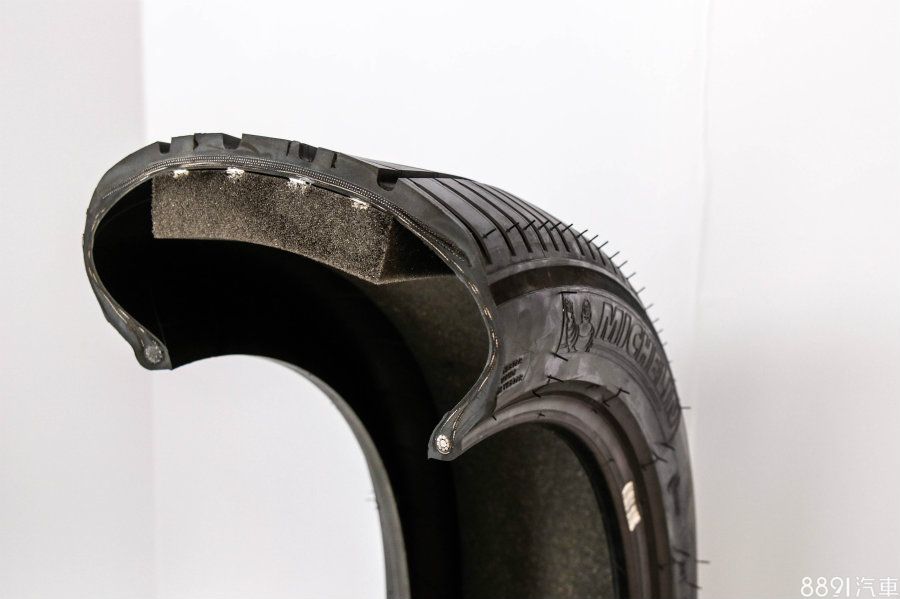 針對部分產品,米其林在輪胎內側多鋪一層Acoustic靜音棉,厚度就如圖所示,可阻絕、吸收滾動時的噪音,根據米其林所述,最多可降低7~8dB分貝。