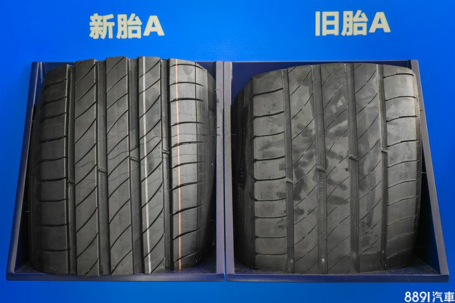 米其林強調,藉由胎紋的設計,自家產品縱使經過相當程度的磨耗,能保有一定的排水紋,這張圖與上圖對比,舊胎的胎紋多寡一目了然,因此舊胎保有一定的濕地表現,這樣也能延後換胎時間,對消費者荷包、環境都有幫助。