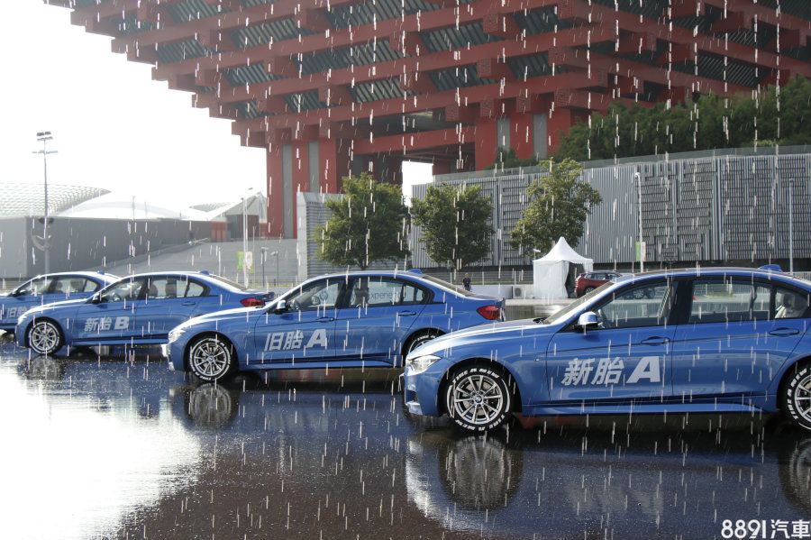 米其林分別在四台車上裝了自家產品新胎A、舊胎A,還有競品新胎B、舊胎B,在溼地上以相同車速、相同起始點進行煞停,至於結果,可以從照片上清楚看出,自家的新胎A自然有最短煞停距離,而有一定磨耗的舊胎A,表現仍比競品新胎B來得好,而最差的也就是競品舊胎B。