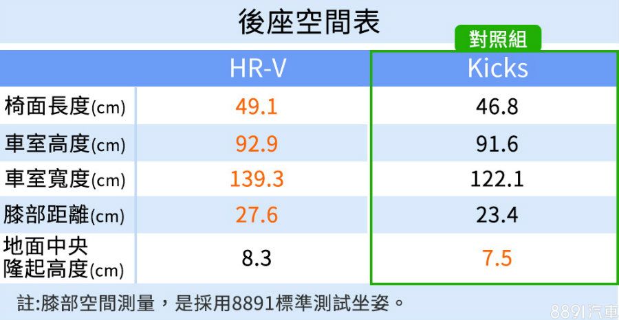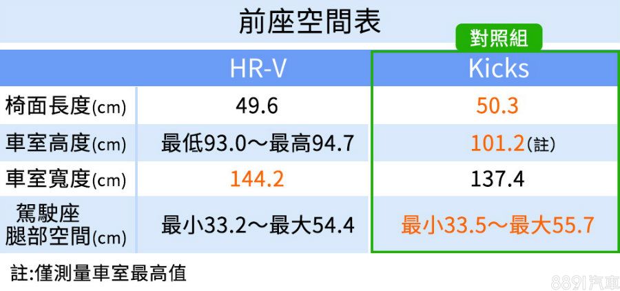 HR-V後座空間與前座同樣出色,以數據對照來看,除了地面中央隆起略高之外,其餘每一項都勝過對手Kicks,若你在乎後座空間,那哪一部較適合你,答案非常清楚!