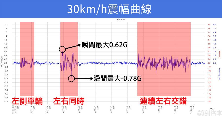 2.震動計算起點統一:起始點為前輪壓到第一根減速條,震動儀產生G值開始計算。後輪壓到最後一根減震條、震動回復近於0時為計算終了。在車速一致、計算起終點都相同之下,所測得的震動數據即可橫向對比。