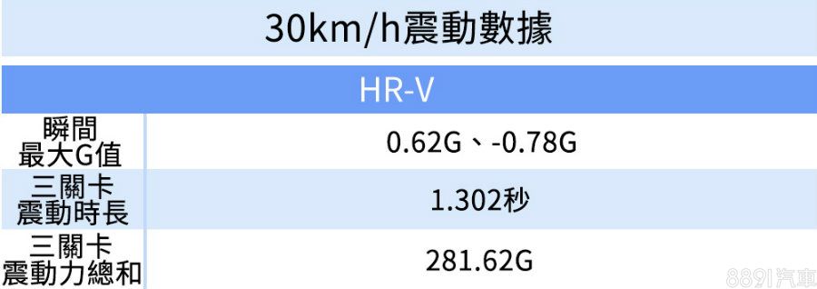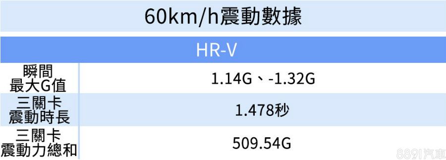 從數據分析、HR-V最大G值僅落在正負0.7G,吸收震盪的能力頗為出色,對應30km/h車速著實游刃有餘,阻尼能夠吸收突如其來且快速的震盪,讓震動力總和與震動時長也都有較低的數據,標準舒適又能兼顧穩定的懸吊設定。