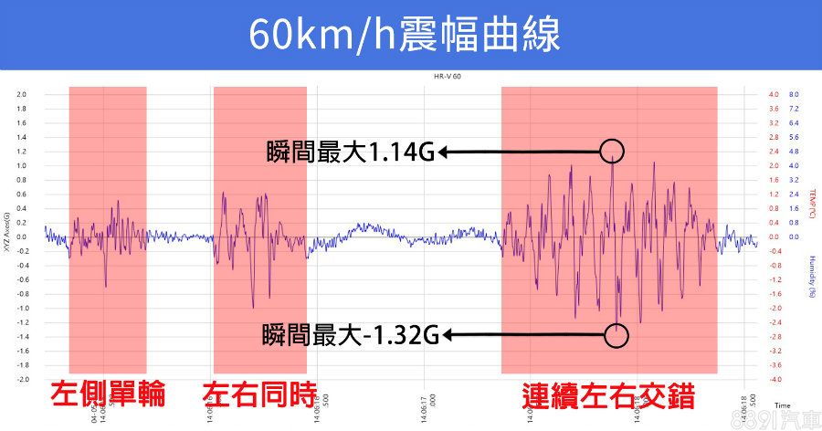 將車速提高至60km/h,更強的路面衝擊讓曲線上下震盪更為劇烈,整體而言仍然有不錯的舒適表現,沒有過多二次震動、連續左右關卡也能有效吸收震盪,沒有突如其來的起伏,最大G值控制在1.2、1.3G範圍內,表現不錯。