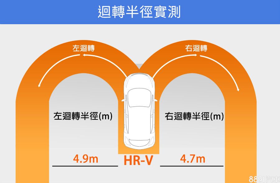 HR-V車長僅約4.3m,迴轉半徑卻沒有預期中來的小,實測數據與中型房車相當,而左右迴轉差距約20cm,日常行車應不致有明顯差異。