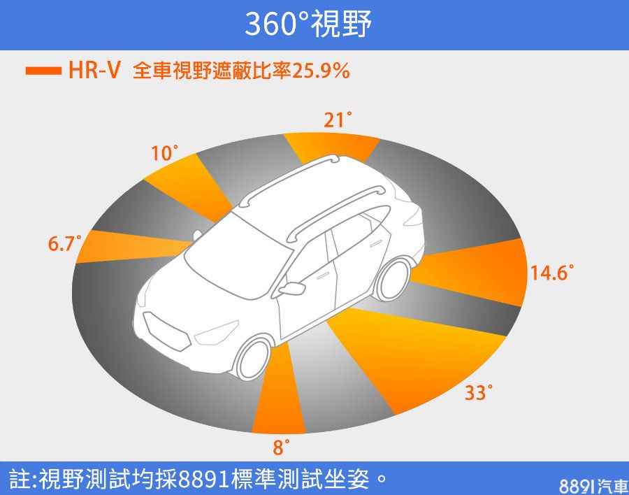 參考過往測試五門SUV的經驗,HR-V的360度視野表現中庸,兩側A柱視線良好,開車時並不會產生太多死角;唯有駕駛座側B柱視線死角略大,進而影響整體視野遮蔽率,變換車道時得多轉頭觀察才是。