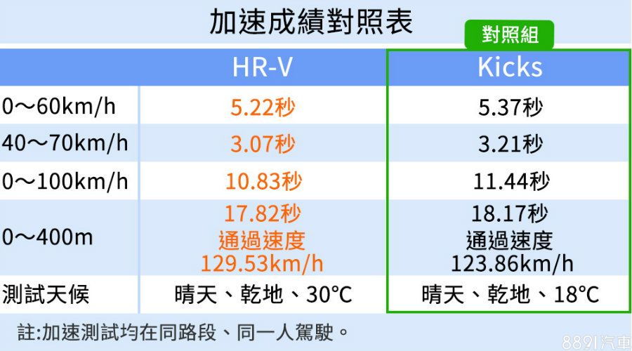 HR-V的CVT變速箱雖能模擬七速換檔,但除了手排模式之外,D檔行駛並沒有換檔動作,全油門就是ㄧ檔到底!實測其加速表現,起步表現輕盈,進入高轉速域也能維持衝刺力道,最終百里加速測得10.83秒,0~400m末速近130km/h的成績,以當日炎熱的氣溫條件下,仍比Kicks實測紀錄優秀,在加速表現上相當出色!