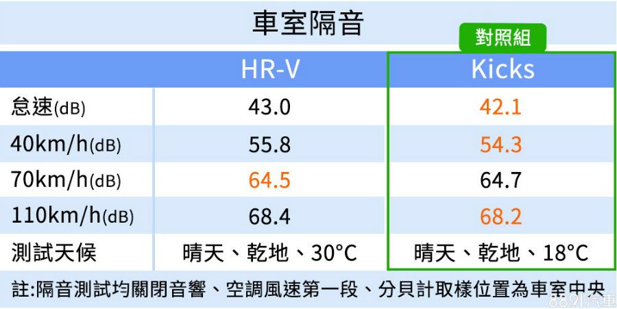 原廠強調小改款HR-V針對車室隔音優化,實際感受是以胎躁降低最為明顯,這得歸功於配胎從性能取向的Dunlop SP Sport Maxx改為瑪吉斯MA-P2,屬寧靜、通勤等級胎款,若與過去Kicks測試數據做對比,在不同測試日,但同樣路段、均為乾地的情況下,HR-V均以微幅差距落後Kicks。