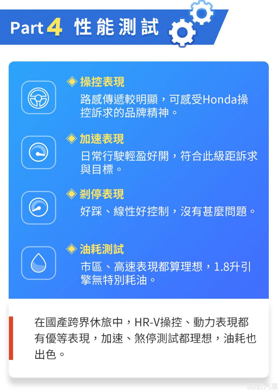 雖然HR-V不是強調操控性的車款,但操控表現挺不錯的,別誤會,絕對不是犀利、精準,那是鋼砲在追求的,HR-V只是跨界休旅,但車頭指向性對比同級稱得上明確,車身穩定性也理想,不會有左搖右晃情形,可以感受到這是一部Honda!
