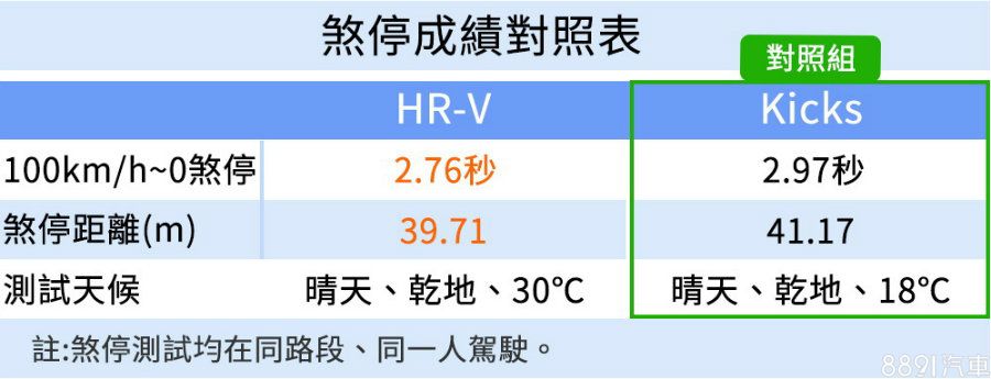 HR-V煞車腳感線性,輕踩不易點頭、重踩煞車又能獲得足夠力道,實測結果比對照組Kicks優異。