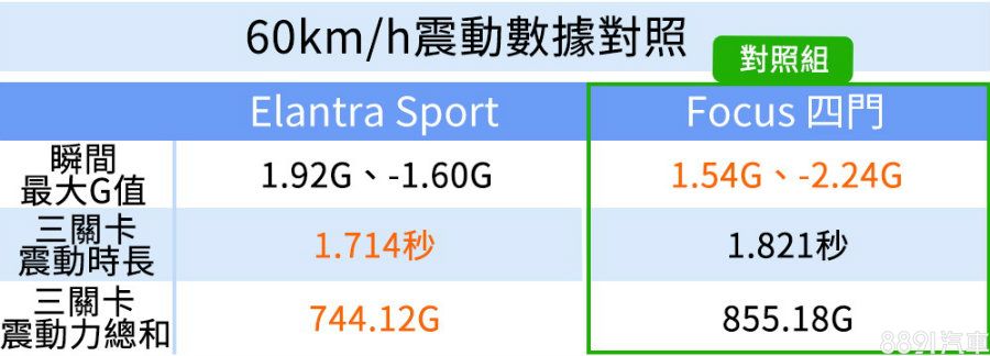 Elantra Sport在60km/h測試中,各項數據僅微幅增加,代表懸吊設定較著重中高速的穩定性,不僅最大G值均未突破2G、G力總和與震動時長也比對照組Focus四門旗艦版表現要來的更好,行路質感與底盤吸震能力比起低速行駛好上不少。