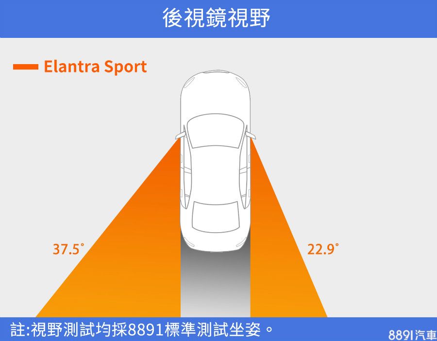 不論測試或實際感受,Elantra Sport的A、B、C柱的遮蔽角度都不大,因此能提供開闊的駕駛視野,22.3%遮蔽率也是目前受測房車中最少的,視野開闊,自然有助於掌握車身四周情形。