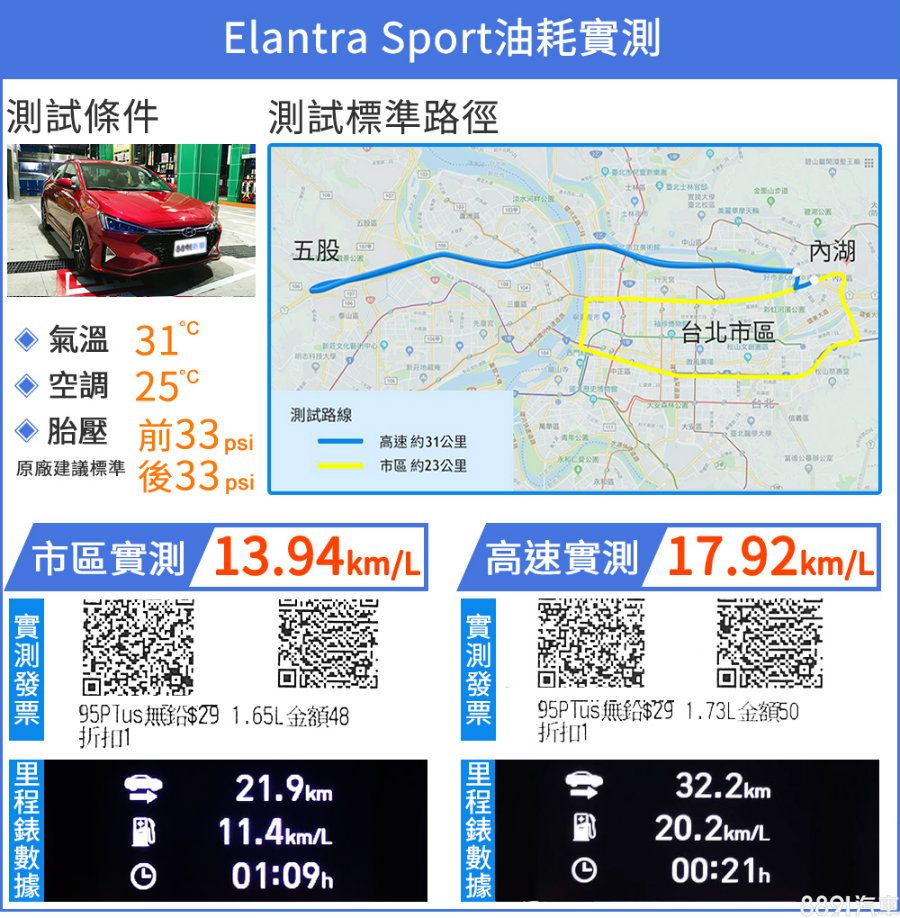 Elantra Sport在代步情況的動力反應十分輕快,低速扭力充沛,油門輕踩便能達到理想速度,自然也利於油耗表現,以實測結果來看,市區部分甚至比旅程電腦更好,高速區段則有約18km/L的優異成績,可說性能與節能都全盤顧及。