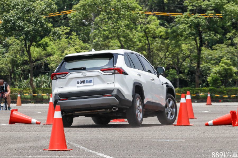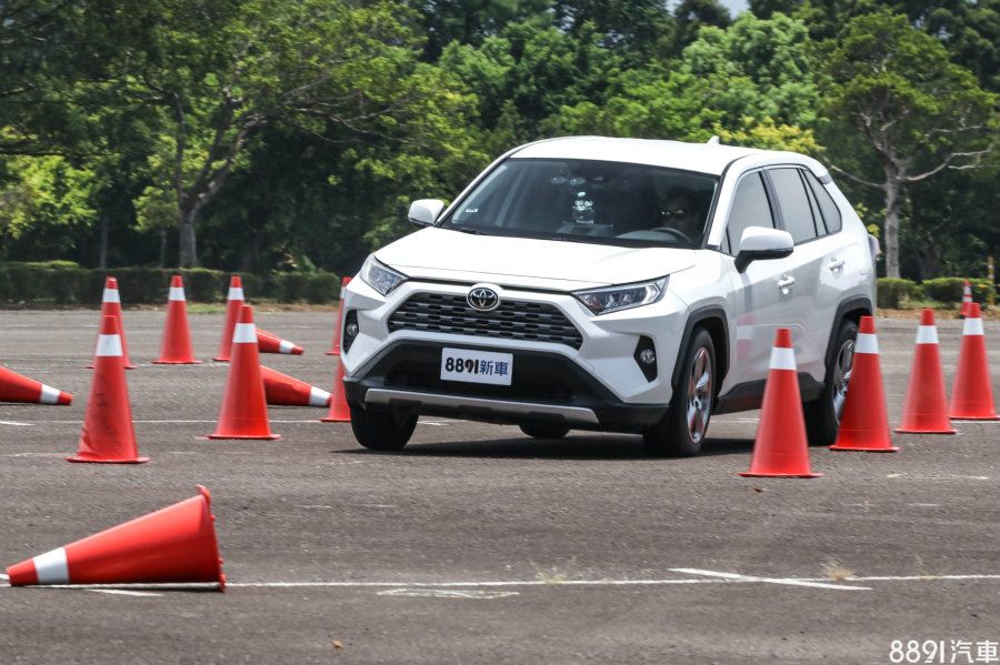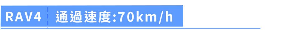 RAV4能以70km/h順利通過麋鹿測試,不過無論是車頭照或是影片,都可清楚看出車尾有明顯偏滑,駕駛必須要瞬間修正,否則可能會有更明顯偏擺,這點特別提出。挑戰75km/h時,車尾偏滑加大,因而掃到錐桶,同時後輪避震器也有因無法有效吸震,讓車體有跳動的情形。