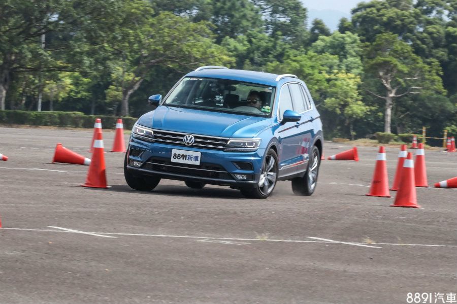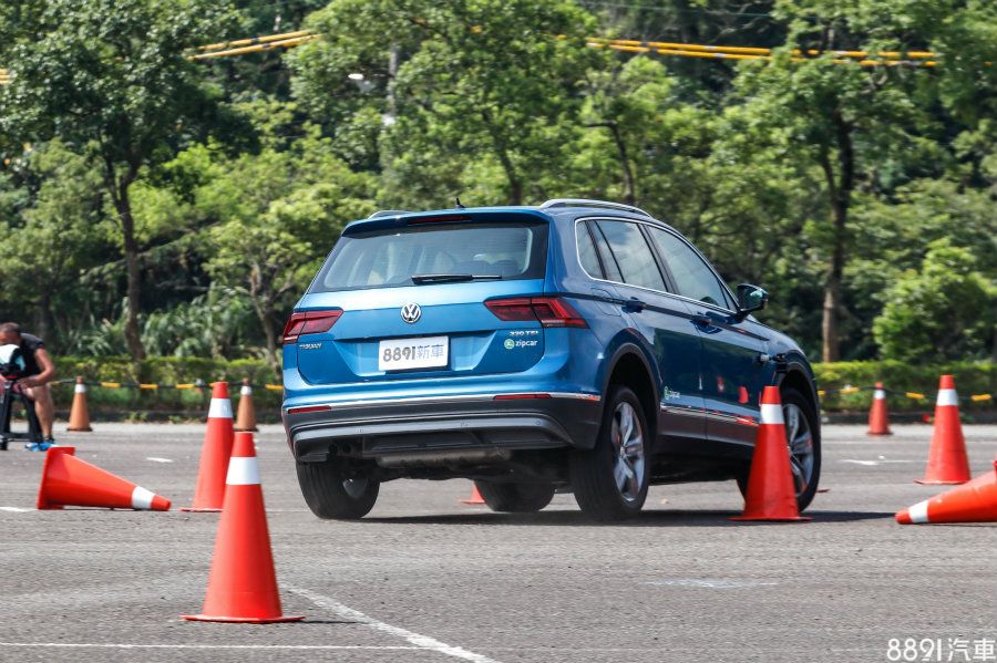 Tiguan能以78km/h通過麋鹿測試,是全場速度最高者,從影片可以清楚看出,在75km/h測試時,車身穩定性仍相當高,兩次變換車道都相當穩定,因此我們提高測試車速,最後測得78km/h為本車極限, 此時車尾才出現較明顯的偏移,80km/h時,車身動態就會突破極限,出現車尾偏滑過多,或是車頭轉向不及,掃倒錐桶的情形。