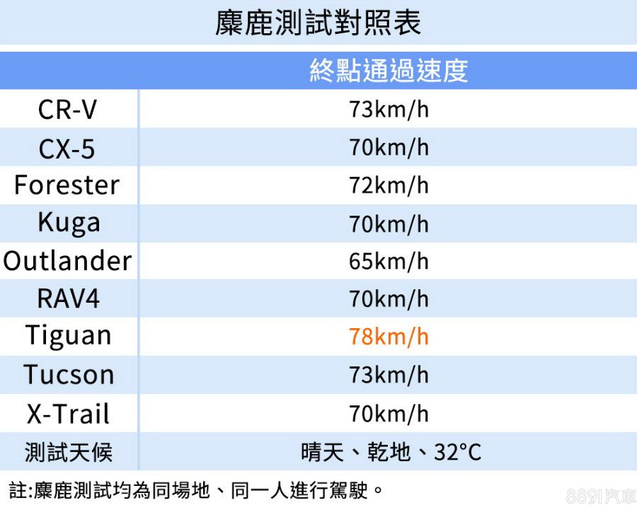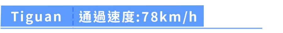 最後把每部車的麋鹿測試成績列出,70km/h算是一個正常表現的數值,此次多數車都能達成,而不可否認,Tiguan的78km/h表現不僅第一,更是壓倒性領先!