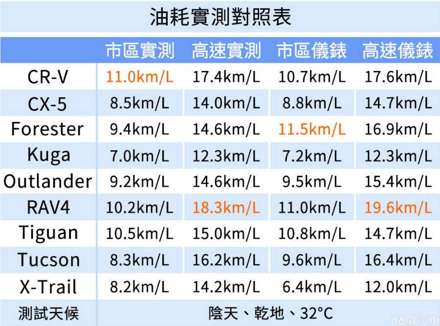 CR-V和RAV4雙雙在油耗實測得到優異成績,市區部分由CR-V領先群雄,展現小排量渦輪引擎的節能功力,並且在高速實測僅落後於RAV4,另一方面也代表Toyota的新世代動力有高效率表現,讓這兩車並列油耗測試冠軍。