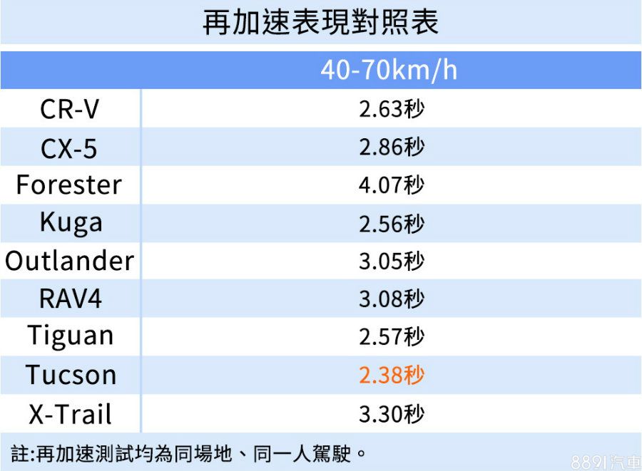 再加速會額外考驗變速箱的換檔即時性,測試在接近40km/h低速巡航時油門到底,變速箱退檔加速的表現,最後結果是Tucson拔得頭籌,擊敗動力王Kuga 245,也勝過同樣是7速雙離合變速箱的Tiguan,這便呈現出真實使用情況的超車能力。
