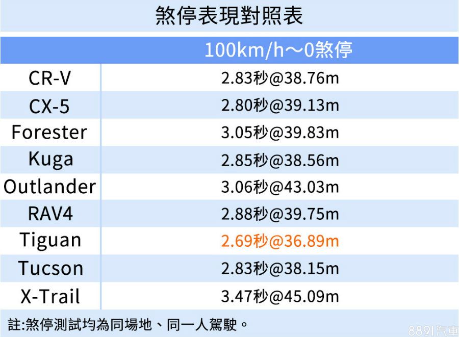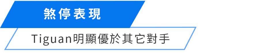 煞停距離是攸關緊急情況安全性的重要環節,在每輛車均為三趟機會的測試條件下,Tiguan繳出全場最佳的36.89m,除了剎車系統本身,Tiguan配胎為Hankook S1 evo2 SUV,屬高等級街胎,對煞停所需抓地力有直接幫助,對比其他同場車輛的配胎,大部分都是節能或舒適取向的產品,畢竟輪胎對性能表現影響甚大,在前文的賽道項目也有類似情況。