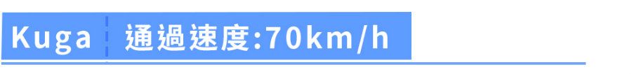 Kuga以70km/h測試,可看出車身側傾不小,後軸則有明顯舉腳現象,進入第二車道後,車尾有測滑情形,不過還在可控範圍內,動態穩定系統介入也不會太突兀,但當車速提升到73km/h,車尾便明顯側滑掃倒錐桶,且無法順利切進第三車道,最後以70km/h收場。