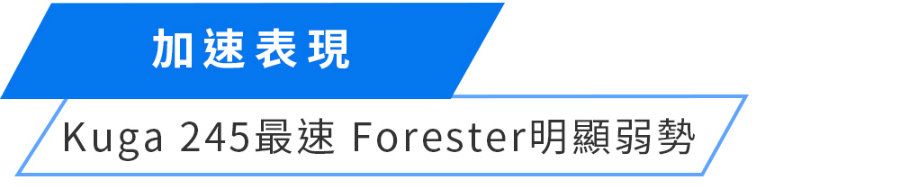Kuga 245奪得加速王寶座並不令人意外,反倒是緊追在後的Tucson、Tiguan和CR-V更值得注意,雖然馬力都不到200hp,性能數據上和Kuga 245有段差距,但0~100km/h都挺進8秒台,通過400m終點成績也頗接近,表現亮眼!中段班則有CX-5、X-Trail、RAV4與Outlander,大致落在同一水準,至於墊底的Forester,動力數據最小,實際的輸出感受溫和,一如預期敬陪末座。