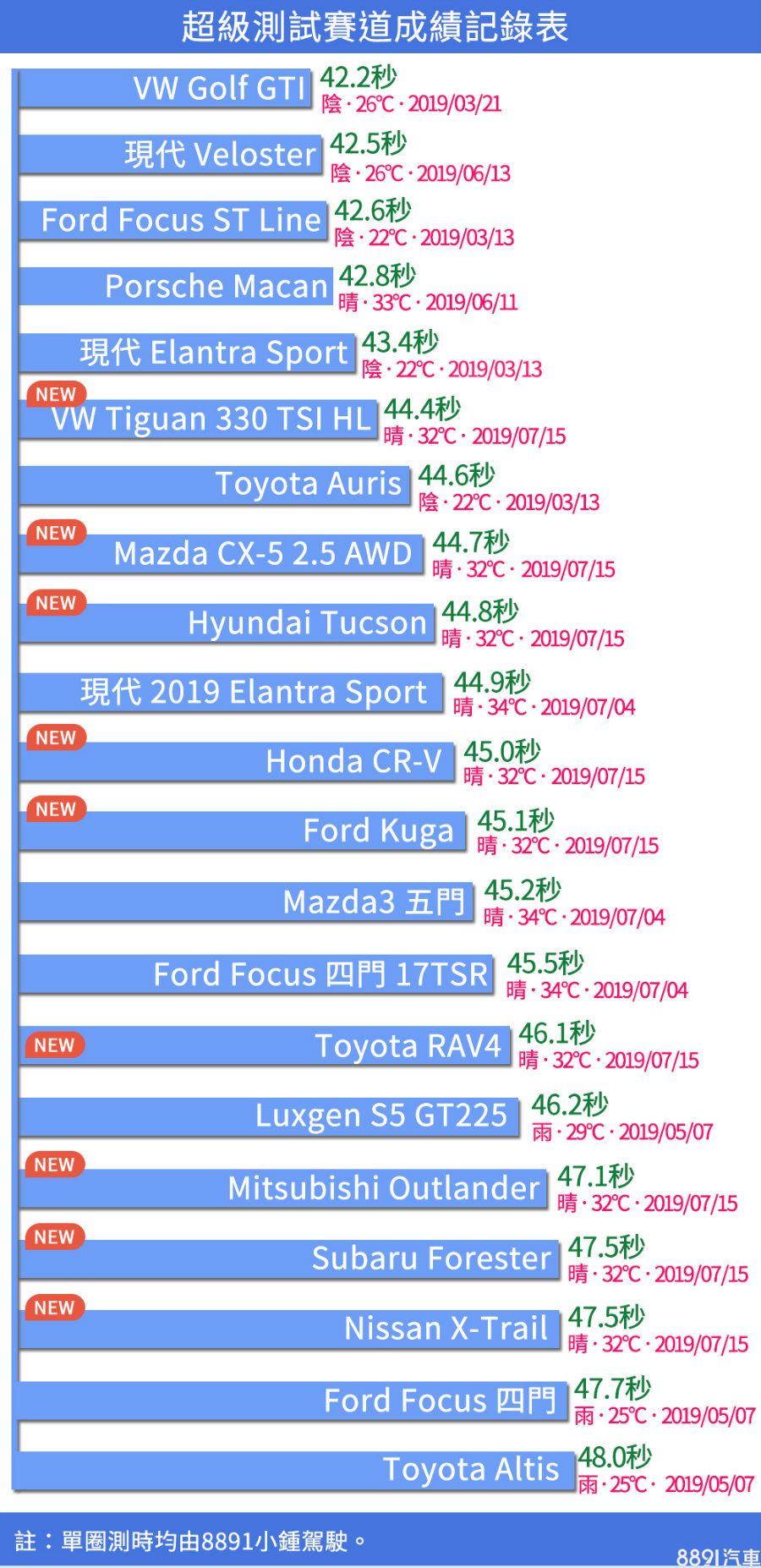 Tiguan 330TSI不負眾望拿下這次最速單圈,以44.4秒領先第二名Tucson的44.8秒,雖然180hp/32.6kgm動力不是最大,但2.0TSI引擎與7速DSG變速箱的契合性沒話說,油門反應、檔位銜接都讓人難挑剔,動力暢快感是9車之最!懸吊阻尼並沒有特別強韌,但支撐性好,轉向感在9車中也較為精準,再加上搭配的Hankook S1evo2 SUV輪胎性能不賴,明顯優於其他車,因此拿下最速單圈算是實至名歸!