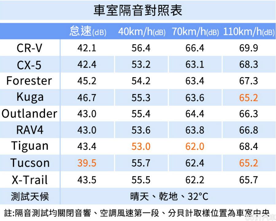 隔音測試結果,Tucson怠速表現明顯比其他車安靜許多;慢速40km/h則是Tiguan最為出色,CX-5也不錯,僅微微高出0.2dB;Tiguan在70km/h同樣領先其他車最為安靜,X-Trail則緊追在後也有不錯表現,而車速拉高至110km/h,反而是Tucson和Kuga最理想,X-Trail以些微差異居第二。