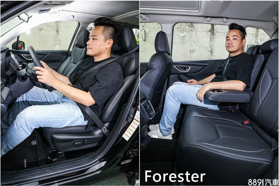 比起其他對手,Forester前座椅的腰部側向支撐更明顯一些,整體舒適度不差,另外一點是兩張前座椅都有電動調整機能,是同級少數有此配置的車款。後座明顯的特點是坐姿設定較高,帶來開闊的視野,各方面空間足夠,且泡棉軟硬設定適中,表現令人滿意,不過對身高174cm的小鍾來說,椅墊長度還是稍短了些。