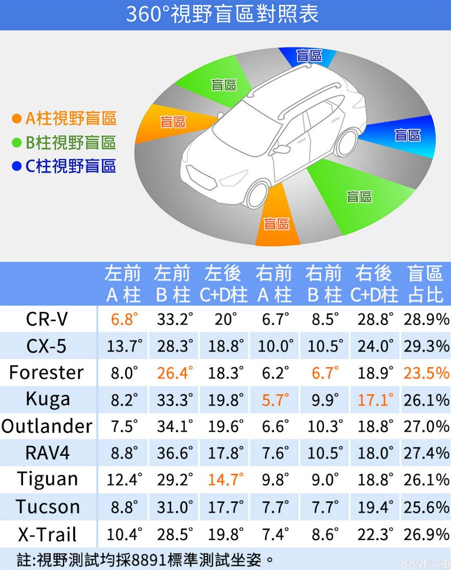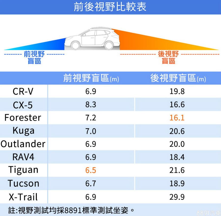 SUV除了空間機能優異,視野亦比房車來得高,但視野高不見得盲區少,九台休旅實際測量之下可有不小差異!前視野表現最好的是Tiguan,中控台平直遮蔽較少,加上高著坐點座椅設定,駕駛起來視線確實不錯;後視野則是Forester,大面積尾窗、低腰線是好視線的功臣,雖然時下休旅多數有配置倒車顯影功能,但好視線對於日常判位仍很加分!