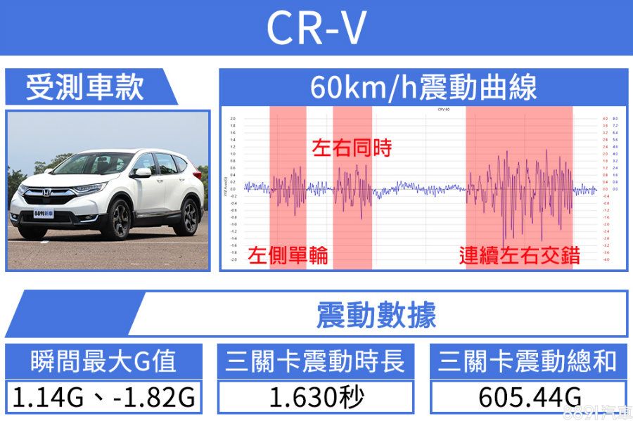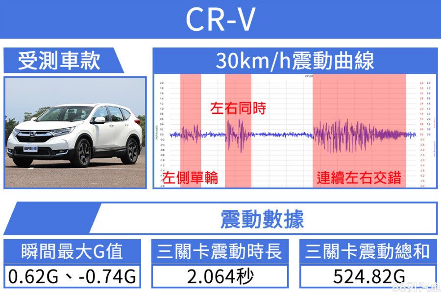 隨著車速提高,CR-V阻尼隨即發揮較好的吸震效果,雖然最大G值相對應增長,但震動時長顯著縮短,震動力總和相較低速增加幅度有限,在60km/h車速下舒適表現令人滿意。
