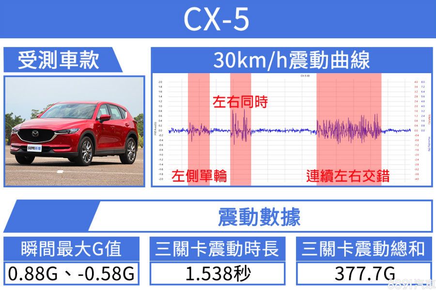 CX-5在九車中較能兼顧舒適與操控,最大G值表現尚可、均未突破1G,且二次晃動輕微,連帶也讓震動力總和表現在九車居中,低速行駛舒適性尚可。