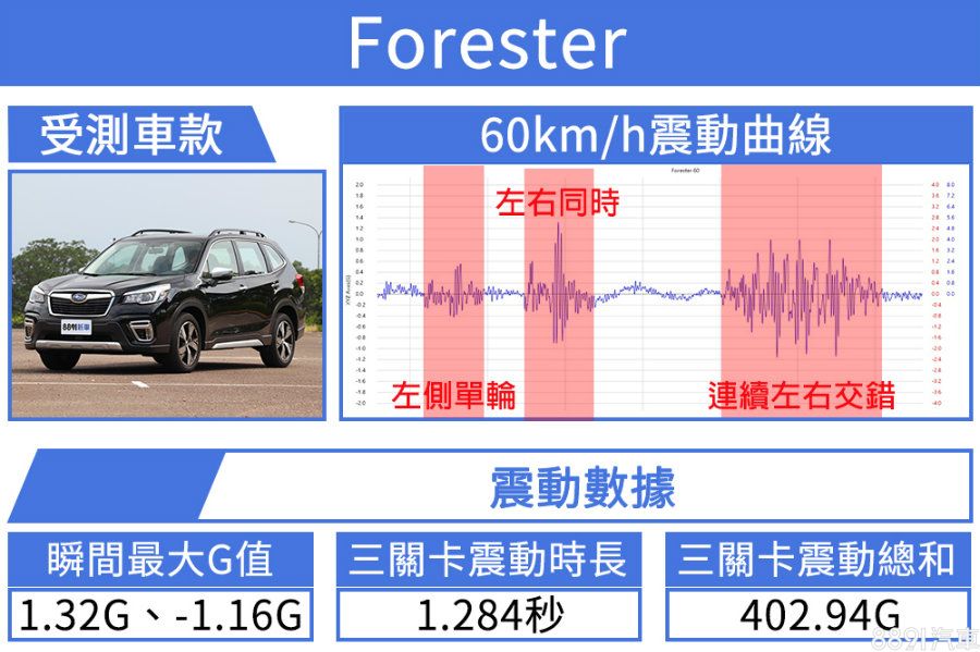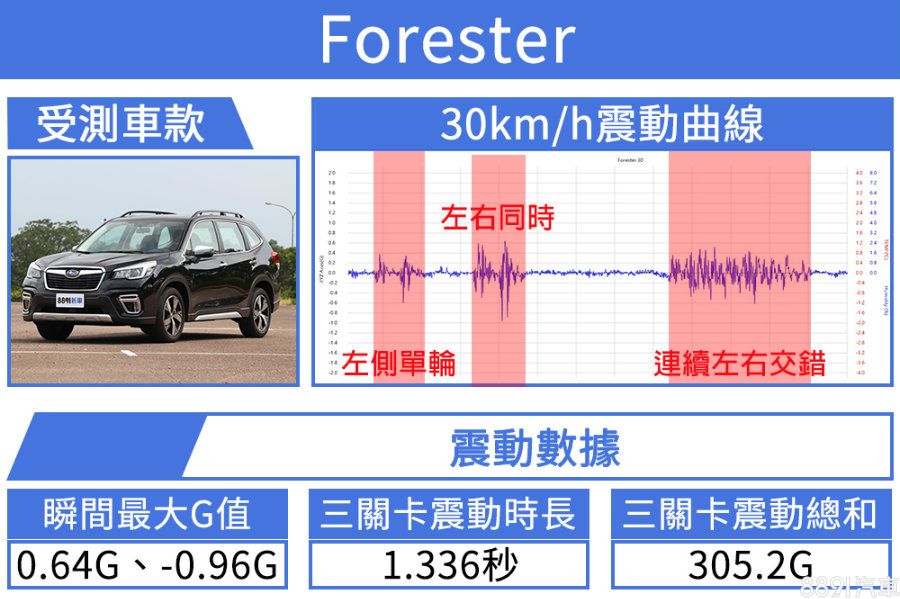 Forester的舒適度並未因車速提高而退步,路面衝擊被有效吸收,最大G值甚至低於部分同級競品在30km/h時的表現,連續震動關卡表現也相當出色,震動力總和僅402.94G穩坐舒適冠軍。