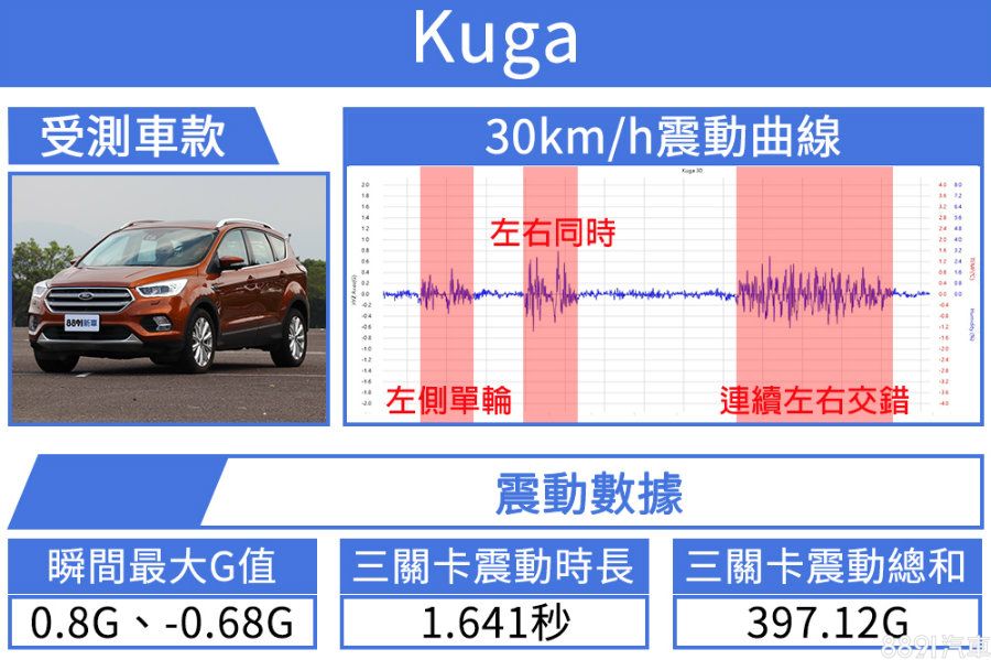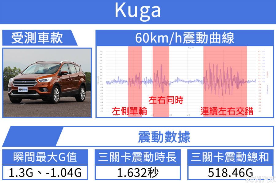 Kuga在60km/h的舒適表現與30km/h相去不遠,最大G值隨車速相對應提升,但阻尼設定卻能適切吸收震盪,唯有二次晃動相較低速略為增加,但乘坐感受仍屬舒適。