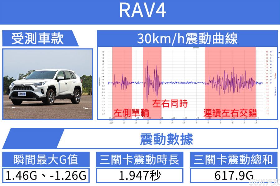 駕著RAV4以60km/h通過陣仗,偏軟的懸吊未能有效吸收震盪,讓RAV4成為九車中測得G值最高的車款;阻尼未能發揮吸震效果讓二次晃動顯著,影響最終震動力總和表現,高達817.48G舒適度不如其他同級對手。