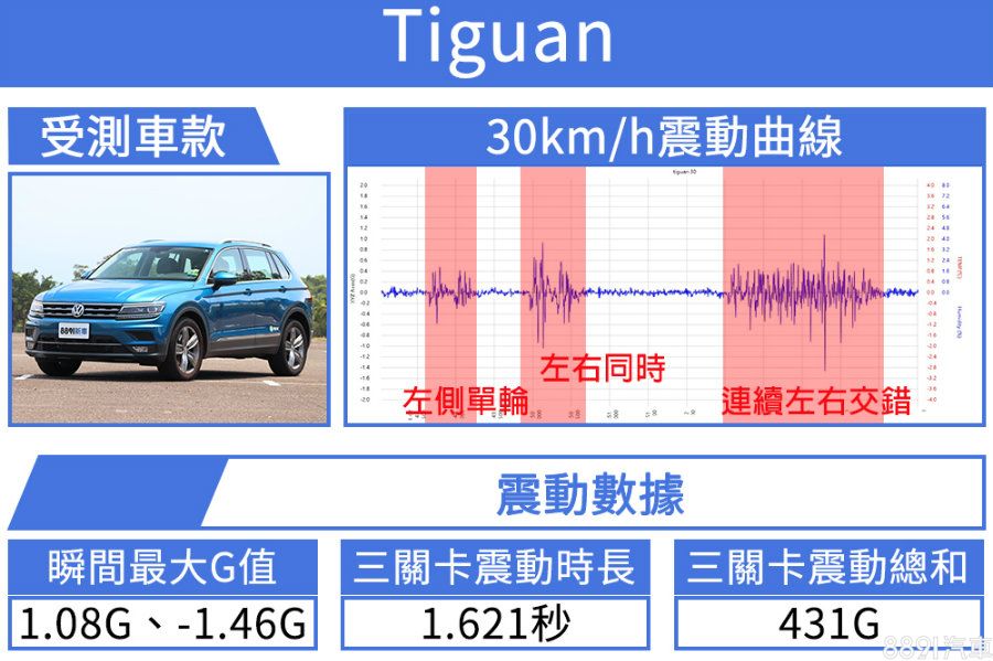2.震動計算起點統一:起始點為前輪壓到第一根減速條,震動儀產生G值開始計算。後輪壓到最後一根減震條、震動回復近於0時為計算終了。在車速一致、計算起終點都相同之下,所測得的震動數據即可橫向對比。