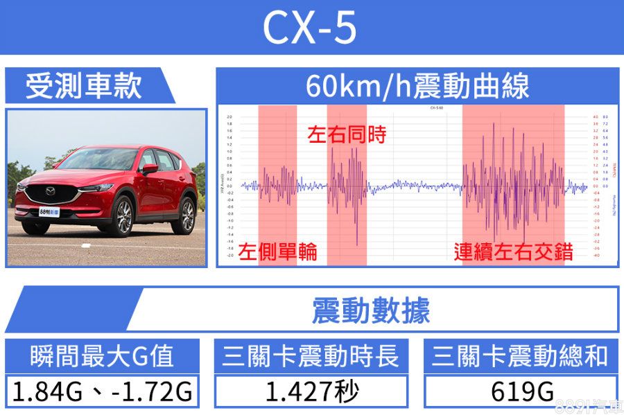 對比CR-V在60km/h表現較佳,CX-5在相同車速下維持著近似的底盤調性,最大G值隨著車速提高而等比增長,二次晃動則同樣輕微,最終測得619G震動力總和,略高於CR-V。