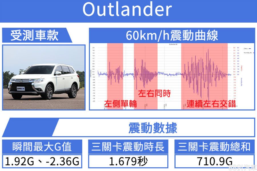 Outlander在60km/h車速下震動感受依然強烈,最大G值甚至達到-2.36G,且阻尼強度未能適切吸收大幅增加的震盪,使得曲線圖看來雜亂並影響震動力總和,表現還有提升空間。