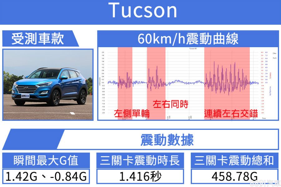 Tucson強調歐系底盤設定,但對比Tiguan懸吊仍相對偏軟,最大G值均保持在1G內,且阻尼設定良好,在震動時長與震動力總和部分表現優異,最終成績僅略遜於Forester。