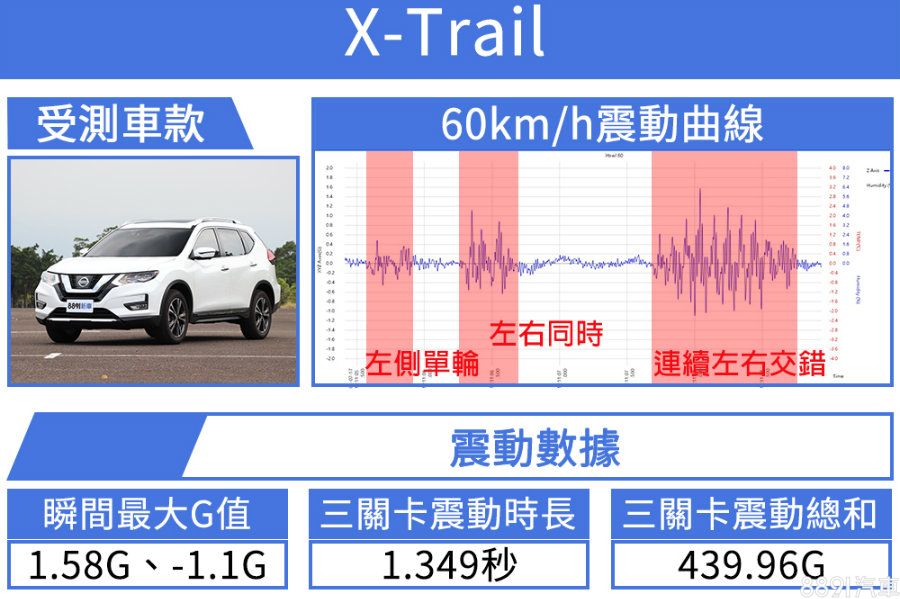 一改低速時稍有二次晃動的特性,X-Trail在60km/h車速下擁有優異的舒適度,最大G值1.58G、-1.1G表現亮眼,且震動時長僅1.349秒、代表阻尼設定良好,能吸收60km/h車速所帶來的震盪,最終測得439.96G的震動力總和,僅略高於Forester。