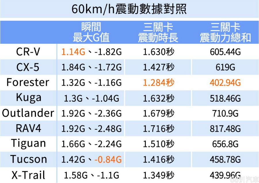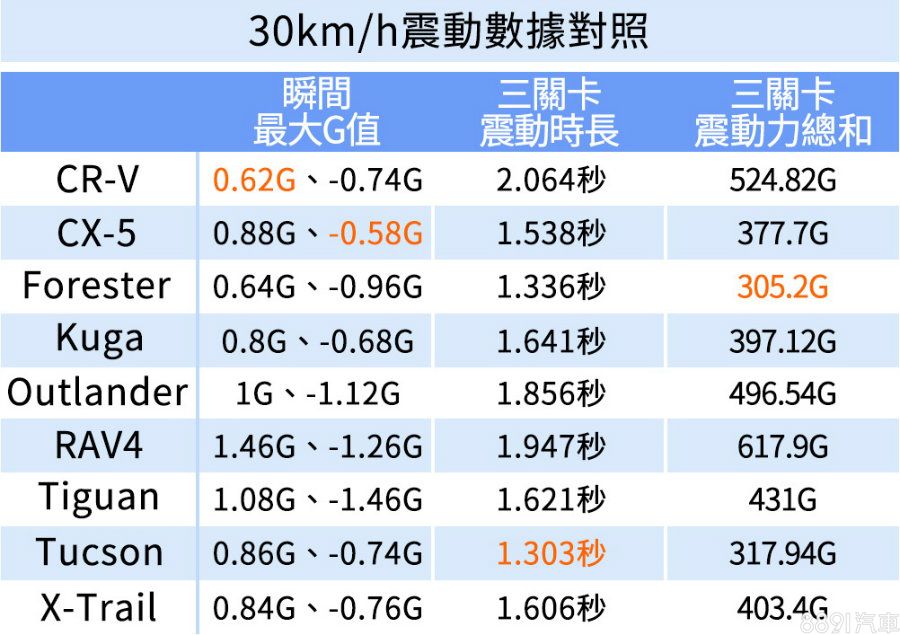 將30km/h震動測試的各項數據列出,雖然各單項最佳數據分散各車,但仔細比對可以發現,CX-5、Forester、Tucson三車最大G值不過大(衝擊感小)、震動時長較短(較不搖晃)、震動力總和較小(整體吸震好),可算是最舒適,而RAV4數據讓人訝異,最大G值大、震動時長偏長、震動力總和更是驚人,慢速震動測試最不理想。