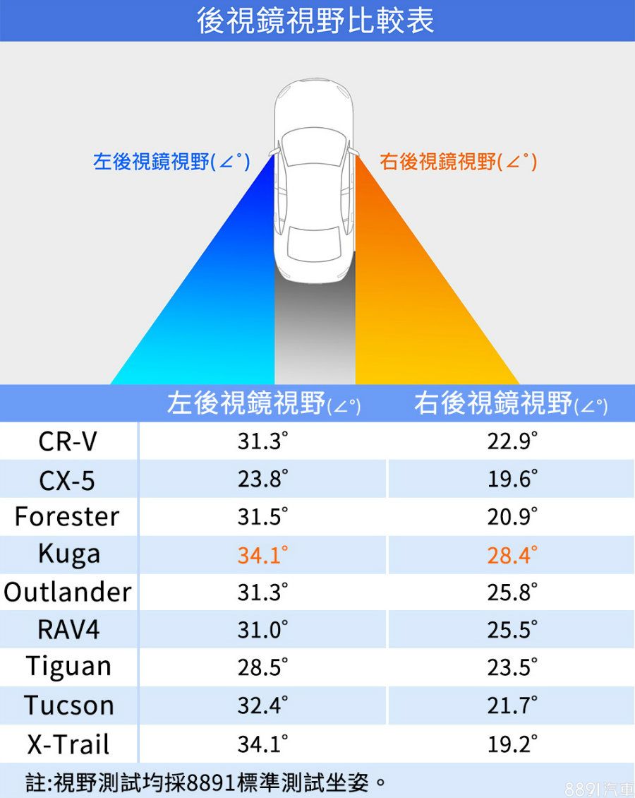 Kuga後視鏡面積大且有廣角鏡設計,不論是左後鏡的34.1度、還是右28.4度,皆為本次評測最廣者,行車時擁有最大可視角度。