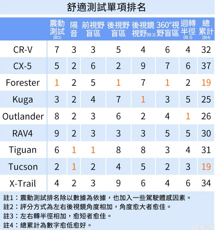 舒適性測試中,Forester拿下頗多單項第一表現,也讓總累計排名最佳,而Tucson居然也並列第一,Tucson性能測試拿第二名,動靜皆宜的感覺,產品實力著實不錯,到是性能測試第一的Tiguan,舒適性測試排名只位居中間位置,至於末位的CX-5,主要是前視野盲區、後視鏡視野拉低排名,頗為可惜。