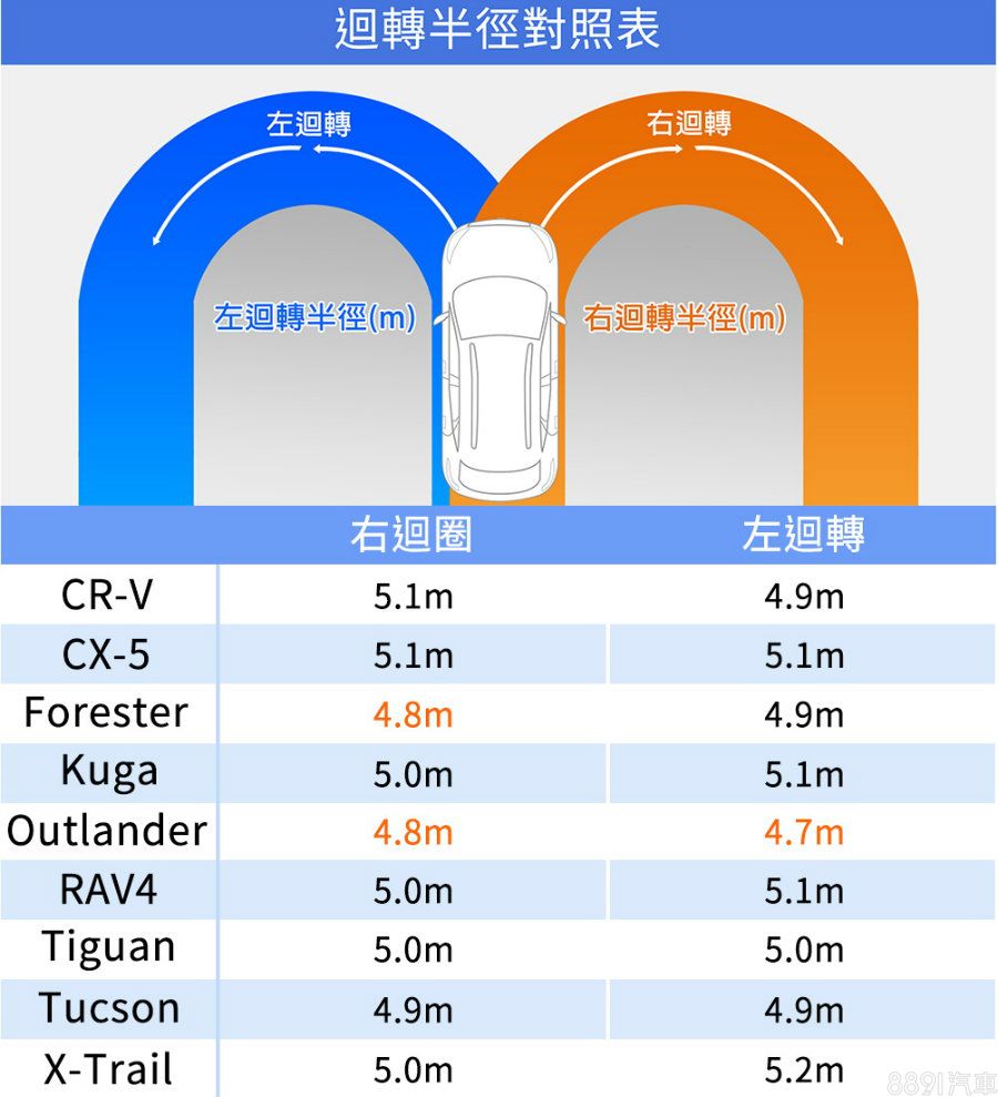 以測試結果來看,眾家休旅車型的迴轉半徑無大幅差異,數據都坐落在左、右5m,參考過往超級測試數據,而距離該區間與一般中型房車相仿;硬要分個高下,Outlander的左右4.8m、4.7m為最短,但實際迴轉起來各車體感差異有限!