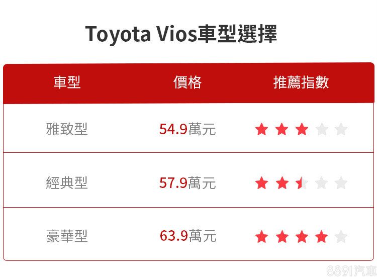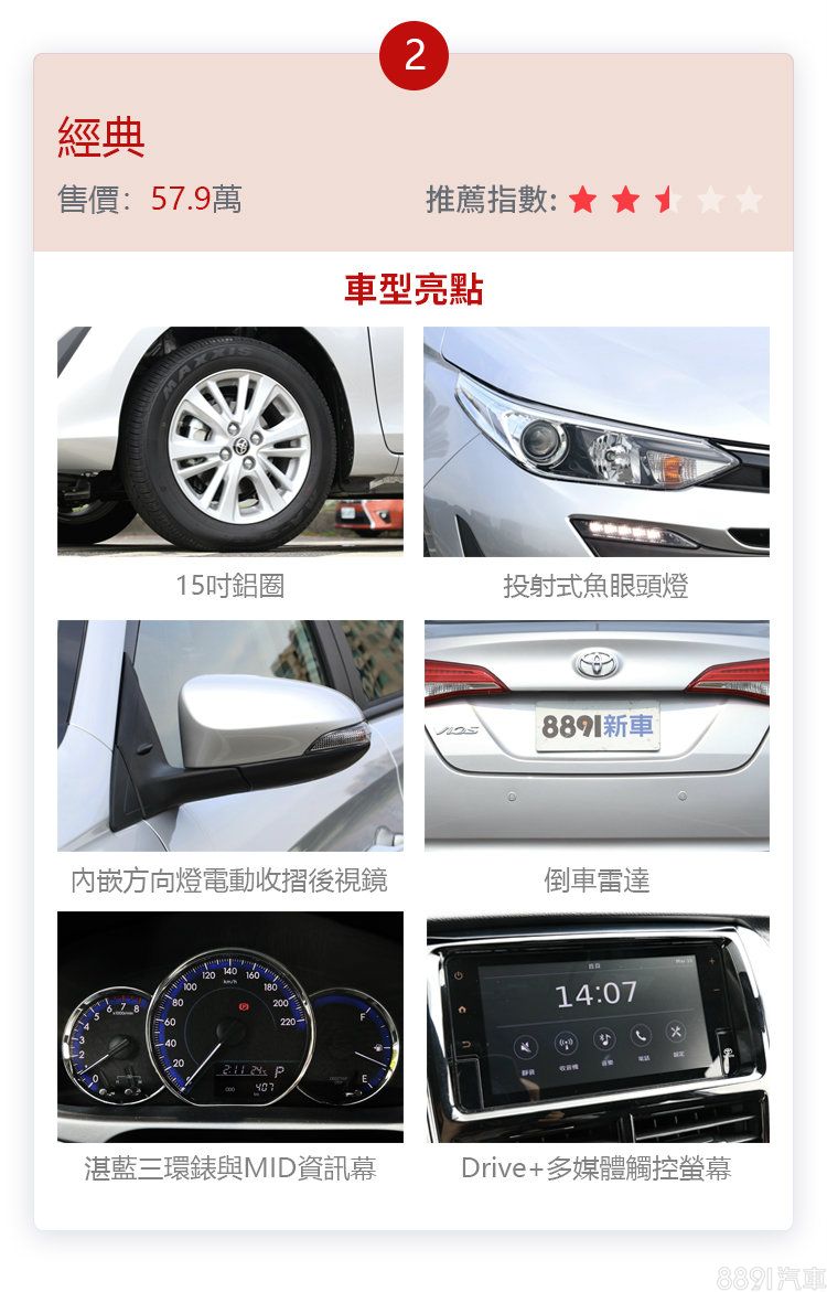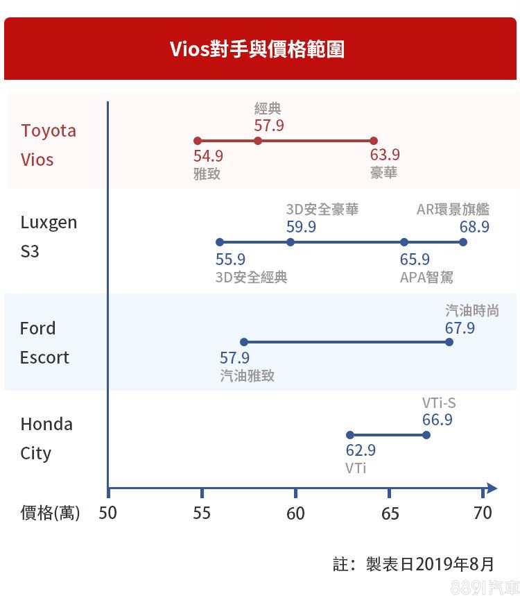 Vios自小改款後縮減編成為三車型,由入門至頂規依序為雅致型、經典型與豪華型,車系價格帶則落在54.9~63.9萬元間,各車型間在配備上也有鮮明的定位區別,而其中更有兩車型開價不到60萬,訂價策略在預算型市場中更有著價格吸引力。