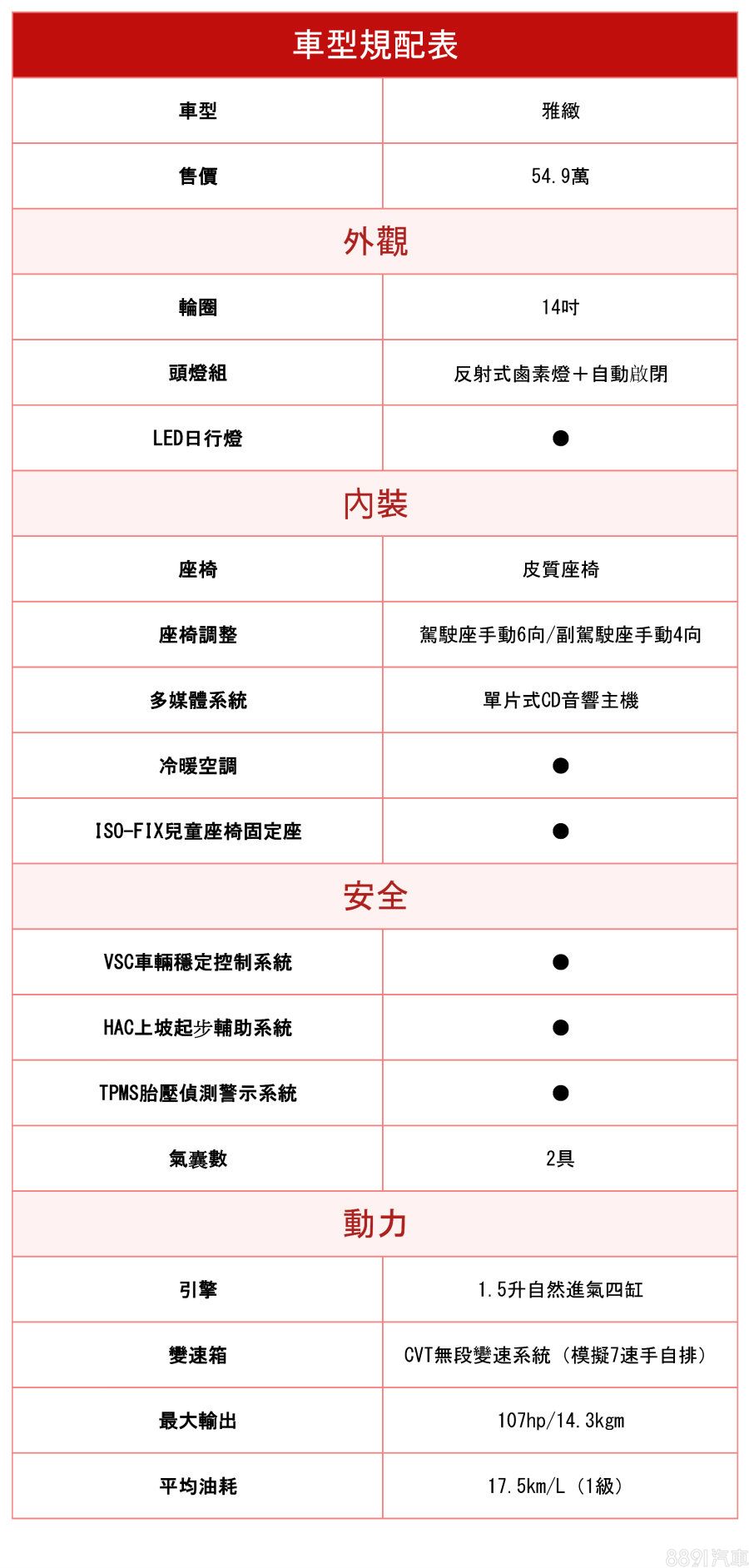 作為入門的雅緻版,展現極致的經濟性導向,打出54.9萬的同級最低價,配備難免陽春了些,如雙氣囊、VSC電子車身穩定、TRC循跡防滑、HAS斜坡起步、胎壓偵測與ISO-FIX固定座等,只能說是不應欠缺「基本款」的配備。但樂觀一點,CD音響主機雖不若觸控螢幕新穎,但使用的上手度可不見得會較為遜色。