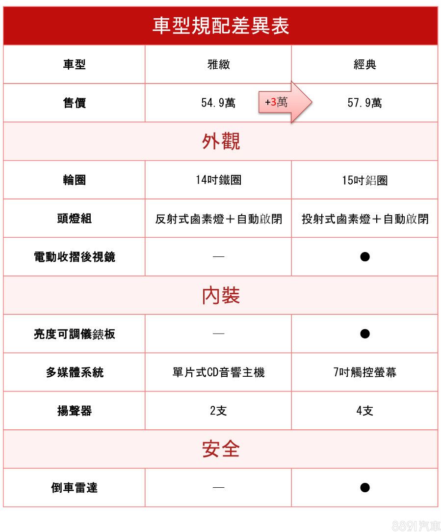 中階的經典款,與入門款有著3萬價差,主要升級偏向質感導向,並自此階起標配15吋鋁圈、魚眼鹵素頭燈、電動收折後視鏡、Drive+系統與觸控螢幕等配備,內裝也運用更多飾件做細節妝點。但整體而言,配備看似豐富,卻不免讓人略感花拳繡腿,不僅實用度有限,安全配備甚至僅比入門款多了圖像式倒車雷達,不如省略前述配備來強化被動安全反倒更加實際!