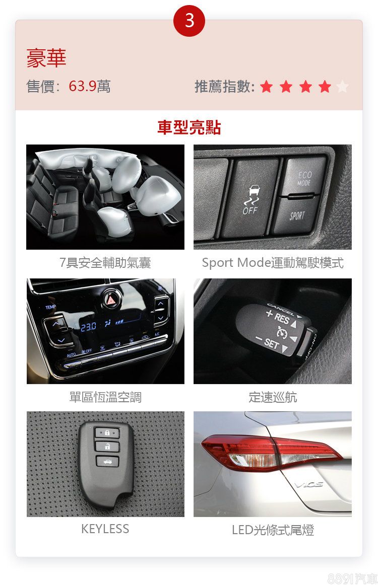 做為一款入門定位房車,不敢說在動力與空間有多少要求,但好養、保值、高妥善率是Vios在同級中的購車誘因,而抉擇點則落在配備豐富度。不考慮選配,兼具安全與實用的豪華型會是較推薦的選擇;反之在預算限制下,雅致款加價6.5萬加購前後雷達、盲點偵測、車門防撞警示燈、排檔鎖與防盜系統,仍值得考慮。但中高階如還有選配意願,則不妨參考69.8萬的入門新Altis,除空間外更標配TNGA底盤、7氣囊與TSS主動安全,會是更理想的選擇。