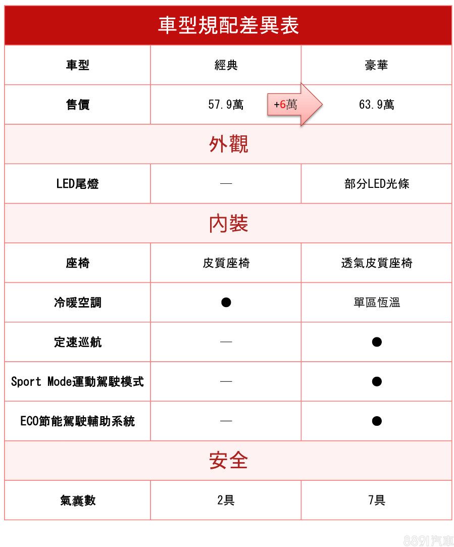 基本價唯一破60萬的頂規豪華型,同時也是小改後的主打星,重點更新除了前述之「Sport運動」、「Eco節能」的駕駛模式選擇機能,也追加標配7氣囊。除此之外,包含Keyless、單區恆溫空調與定速巡航機能,亦僅配備於豪華型上頭!即便與雅緻版有著9萬價差,但頂規擁有更完善的安全輔助與實用性配備,使其在車系中相對是款較受推薦的選擇。