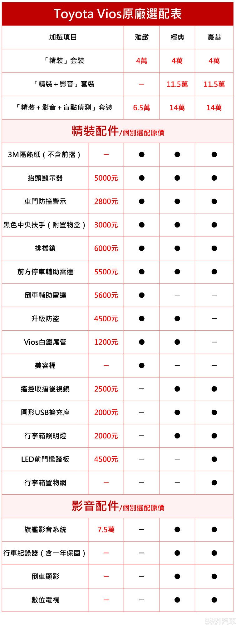 即便在品牌中屬入門產品,Vios也具備多樣加購配備與精裝套件供選配,參考經銷商國都之選配資訊,與Yaris同樣提供「精裝配件」與「精裝+影音」、「精裝+影音+盲區警示」等套餐選擇,其中部分配備亦可個別選購。
