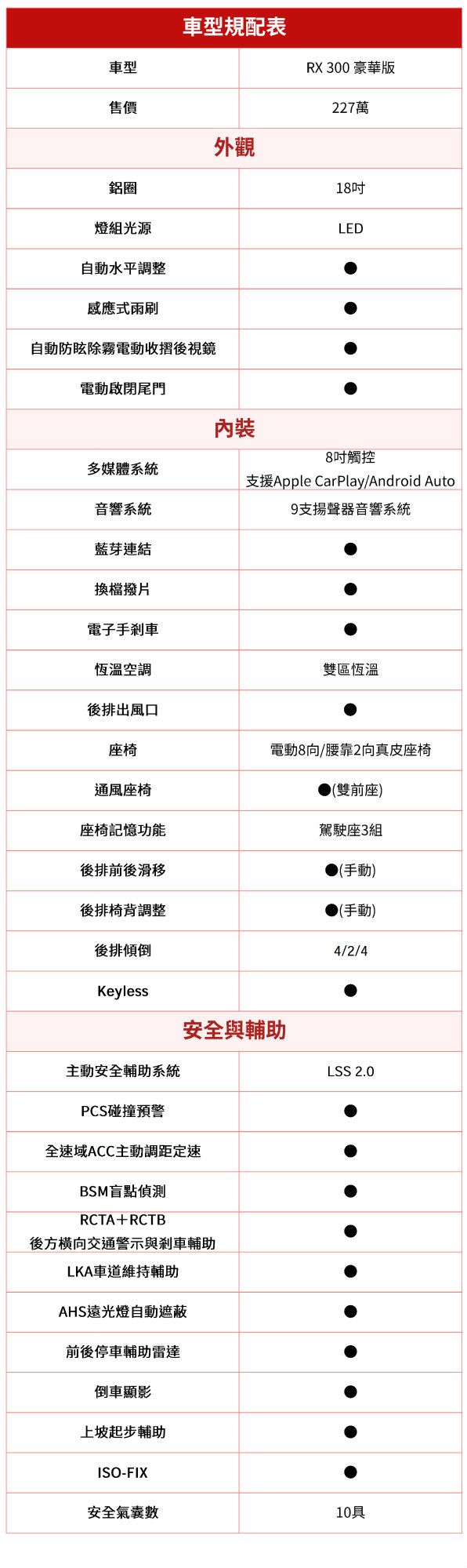 入門的豪華型,明顯是以價格為主要戰略考量的車型,定價不僅是同級最便宜,不到230萬的售價更下探豪華中型休旅的價格帶。此外,完整的LSS 2.0主動安全系統隨RX小改正是導入國內市場,且採全車系標配提供,更提高了RX 300豪華版的吸引力,對於預算緊繃的買家不失為一划算選擇。不過,若希望能有與豪華品牌相符的質感呈現,配備等級較高的車型可能會更為合適。