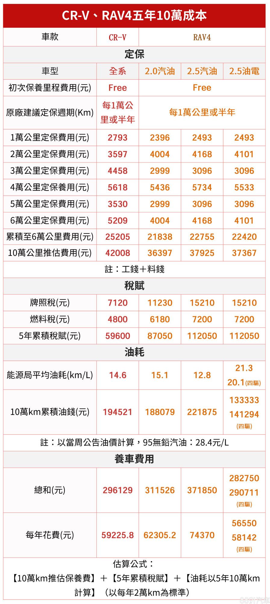 由於「雙田」在國內的普及程度,在原廠維修保養上,均無須擔心據點少的問題,定期保養費用部分,也都十分親民,不過還是RAV4更「友善」些,另此表能明顯看到在養車成本上,「油錢」所佔的比重,油電車確實能節省不少日常開銷,話說回來,雖說油電車型能有感節省養車費用,但如電池等部件萬一需要更換,可是「大條」的喔,相形之下還是CR-V的小排量渦輪動力整體C/P值更高些。